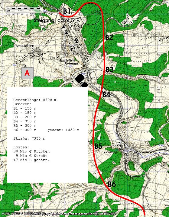 Von Geislingen kommen über eine neue Brücke über die Bahn und mit ca. 4,5 %